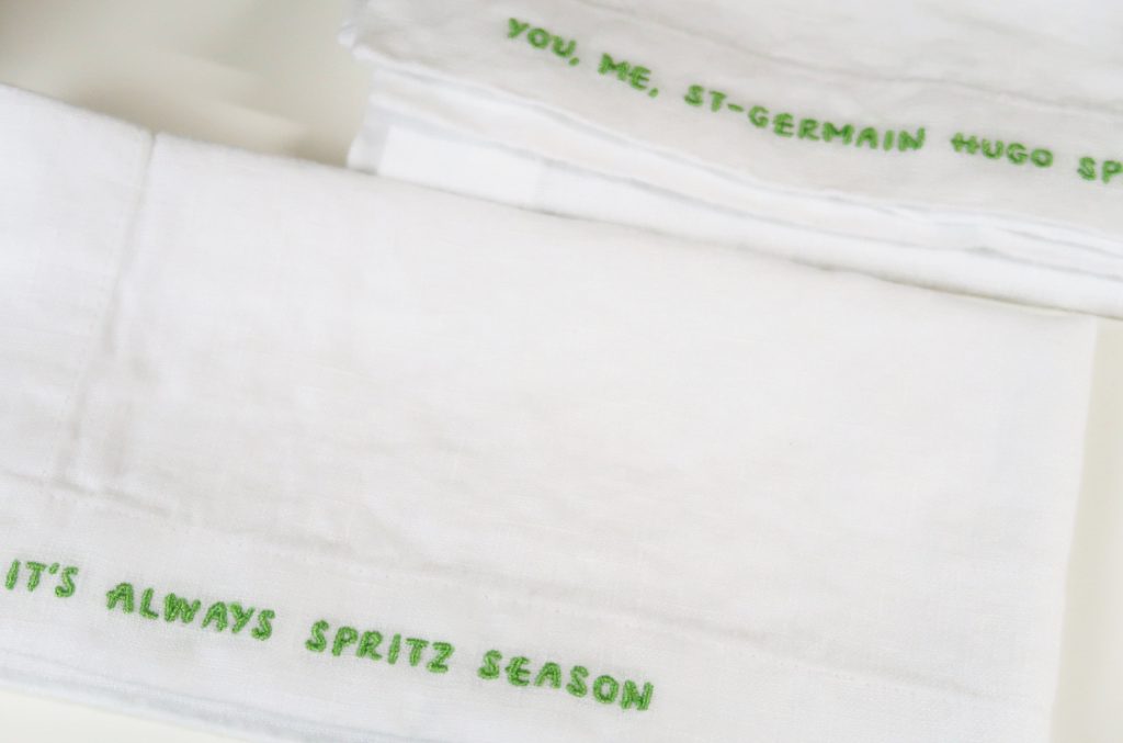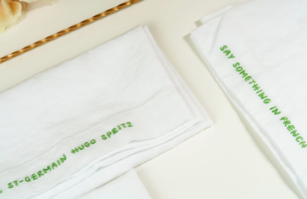 The Arkitaip Linen Napkins are embroidered. Adding a playful touch to your table setting with “Spritz-Inspired” Mantras.